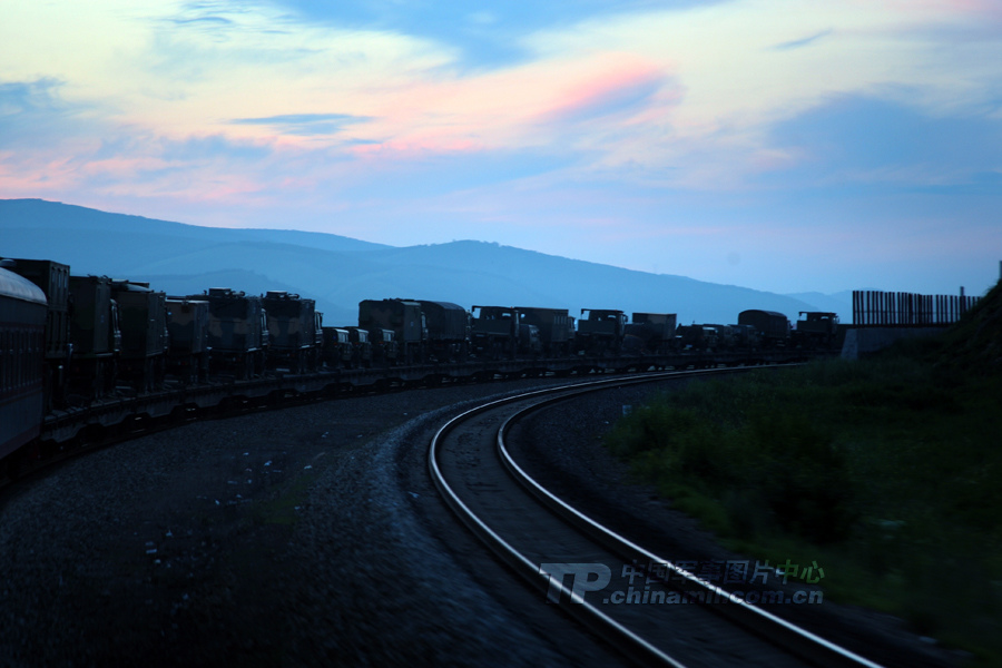 余暉下行進的地轉(zhuǎn)專列。 曹占禮 攝