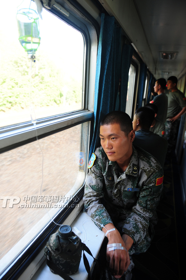 一名戰(zhàn)士在投送列車(chē)上打點(diǎn)滴,生病期間他沒(méi)落下一次訓(xùn)練。蓋旭輝 攝