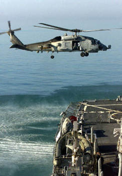 美海軍SH-60“海鷹”直升機(jī)主要用于反潛、反艦攻擊,搜索與救援等任務(wù)。它由驅(qū)逐艦搭載,“海鷹”可以裝備聲波定位器、MK46或MK50型魚雷、AGM-119型“企鵝”導(dǎo)彈及50口徑機(jī)炮等。