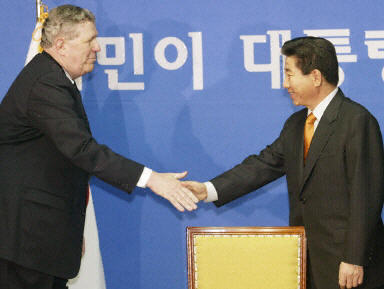 韓國當(dāng)選總統(tǒng)盧武鉉13日在漢城接見了美國總統(tǒng)布什的特使、助理國務(wù)卿凱利,雙方就朝鮮核問題交換了意見。盧武鉉在會(huì)談中強(qiáng)調(diào),韓美兩國應(yīng)通過對(duì)話而不是武力來解決朝鮮核問題。凱利在結(jié)束對(duì)韓國的訪問后,還將前往中國、新加坡、印度尼西亞和日本訪問。