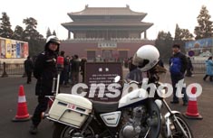 十五日,一位交警正在北京故宮神武門(mén)廣場(chǎng)執(zhí)勤。從當(dāng)天開(kāi)始,神武門(mén)外停車(chē)場(chǎng)被取消。故宮博物院的通告說(shuō),此舉是為了恢復(fù)紫禁城周邊凝重幽靜的壯美景觀。作者:張煒