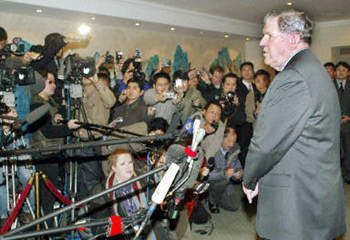 關(guān)于朝核問題,李肇星說,中方堅(jiān)持維護(hù)朝鮮半島的和平與穩(wěn)定,支持朝鮮半島實(shí)現(xiàn)無核化,不贊成在半島上出現(xiàn)核武器,主張通過對(duì)話和平解決問題。中方不贊成朝方退出《不擴(kuò)散核武器條約》(NPT)。