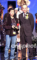 香港青年時(shí)裝設(shè)計(jì)家創(chuàng)作表演賽2003,1月17日在香港時(shí)裝節(jié)上舉行,自由設(shè)計(jì)師馬詩淇〔左〕作品榮獲全場總冠軍。洪少葵 攝