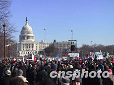 中新社華盛頓一月十八日電(記者 余東暉)數(shù)以萬(wàn)計(jì)的美國(guó)人今天聚集在首都華盛頓的國(guó)會(huì)山前,舉行聲勢(shì)浩大的集會(huì)游行,從而將持續(xù)了一天的全球反戰(zhàn)示威活動(dòng)帶向高潮。