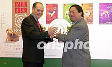 香港郵政署1月19日發(fā)行十二生肖(羊年)特別郵票,香港郵政署長陸炳泉及民政事務(wù)局局長何志平(右)在巨型首日封上蓋印,象徵郵票正式發(fā)行。鄧慶樂 攝