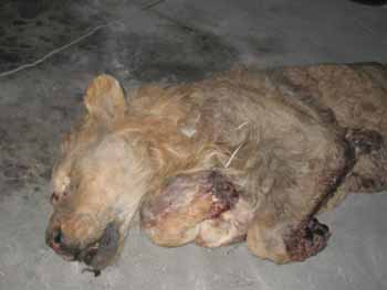 為了配合公安機關(guān)偵查,李滿堂將已經(jīng)包裹好的獅子尸體重新打開,從獅子的表情可以看出死時很痛苦,李滿堂說,大約在最近幾天,他便發(fā)現(xiàn)籠中的兩頭獅子有些不對勁,整日無精打采,不愛吃食。開始以為獅子患了感冒,給獅子吃了些消炎藥,但隨后兩天獅子仍然不見好而且厭食情況一天比一天嚴(yán)重,并開始出現(xiàn)嘔吐癥狀,隨后公園工作人員將嘔吐物送至丹東市動物檢疫站化驗。