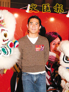 中新網(wǎng)1月24日電 賀歲片《行運(yùn)超人》昨天在香港舉行首映,梁朝偉偷空從《2046》的拍攝現(xiàn)場趕往出席,不過他為免戲中的造型曝光,先將二撇雞須脫下才出現(xiàn),他說這次的造型是他自己構(gòu)思,想給觀眾有不同的感覺。