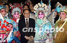 由美國齊淑芳京劇團(tuán)演出的全本中國京劇《楊門女將》1月25日晚在紐約百老匯完成首次演出,這是繼1930年梅蘭芳在紐約演出以來中國京劇又一次登上百老匯舞臺(tái)。圖為中國駐紐約總領(lǐng)事張宏喜祝賀演出成功。作者:趙海燕