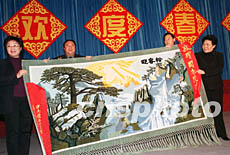 國(guó)務(wù)院僑辦主任陳玉杰(右一)與副主任李海峰(左一),二十七日在僑辦新春聯(lián)歡會(huì)上,代表國(guó)務(wù)院僑辦機(jī)關(guān)接受機(jī)關(guān)定點(diǎn)扶貧地區(qū)甘肅積石山縣代表贈(zèng)送的新年壁毯禮品。作者:鄒憲