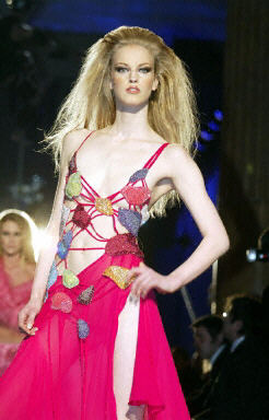 1月26日,羅馬時裝周上模特展示了2004春夏時裝最新流行趨勢。圖為模特展示意大利設(shè)計師Gai Mattiolo 的作品。