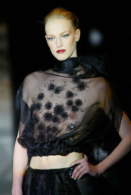 1月26日,羅馬時裝周上模特展示了2004春夏時裝最新流行趨勢。圖為模特展示意大利設(shè)計師Fausto Sarli的作品 。