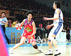 一月二十八日晚,2003中國女籃WCBA全明星賽在河北省秦皇島市奧體中心開賽,八一隊隊員隋菲菲(左)第二次獲得聯(lián)賽最有價值球員稱號。作者:廖文靜