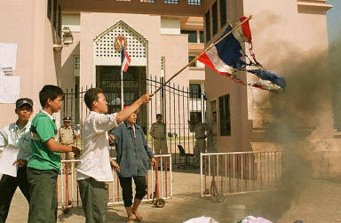 他信在聲明中說,29日傍晚,上千名柬埔寨暴徒借口泰國某位女影星發(fā)表了對柬埔寨不友好的言論,圍攻泰國駐柬大使館,縱火焚燒泰國國旗和使館館舍。同時,部分泰國人在金邊開設(shè)的賓館、商店也遭暴徒搶劫或縱火。