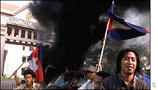 據(jù)BBC報道,縱火燒毀了泰國大使館后,約一千名示威者又攻擊了其他建筑。
