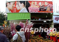 在人流多的香港維園年宵市場(chǎng),港產(chǎn)電影“老鼠愛(ài)上貓”為加強(qiáng)宣傳,在花檔高高掛上宣傳海報(bào)。鄧慶樂(lè) 攝