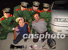 案發(fā)后,福建長樂松下邊防派出所接到長樂市公安局案情通報,迅速組織干警在長樂福清交界處的松下鎮(zhèn)路段進行設卡攔截。下午五時十分左右,劫匪駕車逃逸時發(fā)現(xiàn)有干警在設卡檢查,遂掉轉車頭沿原路瘋狂逃竄,干警隨即緊追不舍,其中二名劫匪被當場擒獲,現(xiàn)場繳獲自制手槍一支(內裝二發(fā)彈)、匕首二把、轎車和手機及贓款二萬零一百三十元人民幣等各類作案工具和贓物。