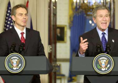 布什在會談結(jié)束后與布萊爾聯(lián)合舉行的記者招待會上說,國務(wù)卿鮑威爾下周將向聯(lián)合國安理會出示證據(jù),證明“薩達(dá)姆正在愚弄世界”。他說,伊拉克問題“將在幾個星期,而不是幾個月內(nèi)得到解決”,美國堅(jiān)決反對任何將伊拉克問題拖延幾個月后再解決的企圖。