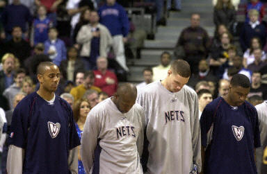 美國航天飛機(jī)哥倫比亞號于北京時間昨天晚間失事,機(jī)上全部7名宇航員全部罹難。圖為美國NBA比賽開始前,新澤西網(wǎng)隊隊員為遇難者進(jìn)行默哀。他們在今天比賽中的對手是底特律活塞隊。