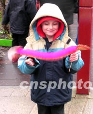 農(nóng)歷新年,英國曼徹斯特唐人街舉行盛大賀歲活動(dòng),圖為英國小童饒有興趣地玩“中國龍”。 盧峰 攝