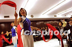 春節(jié)期間,美國芝加哥華人華僑相聚一堂,他們跳起紅綢舞,過個喜氣洋洋的中國節(jié)。作者:王瑤