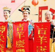 據(jù)臺灣媒體報道,胡志強(qiáng)是7日上午與國民黨另兩位“政治明星”臺北市長馬英九、桃園縣長朱立倫一同在桃園為元宵燈會造勢。朱、馬、胡三人以福、祿、壽三星造型粉墨登場。