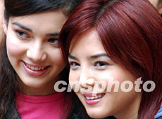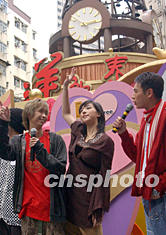 香港歌手李蘢怡、和“明珠大使”保采芬,二月九日出席在銅鑼灣時代廣場舉行的情人節(jié)“戀人短訊”大募集活動。錢興強 攝