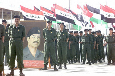 在一個(gè)插滿稱贊薩達(dá)姆的旗幟的體育場(chǎng)上,許多貴賓和學(xué)生在觀看數(shù)萬(wàn)名軍人照著軍樂(lè)隊(duì)的節(jié)拍列隊(duì)行進(jìn),時(shí)間達(dá)兩個(gè)多小時(shí)。這些士兵一面行進(jìn),一面揮舞各式武器,其中包括步槍和火箭筒。