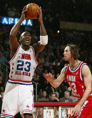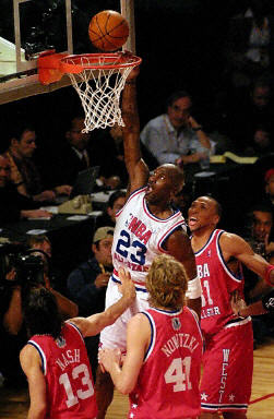 去年以狀元秀身份加盟休斯頓火箭隊的中國球員姚明,以首發(fā)身份為西部聯(lián)盟全明星隊出戰(zhàn)。比賽剛開始,姚明就接到隊友傳球,扣籃成功,為球隊貢獻兩分。在上半場,姚明上場10分鐘,1投1中,2個籃板球,2分。