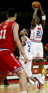 在第二節(jié),西部明星隊(duì)諾維茨基和加內(nèi)特相繼發(fā)威,將比分逐漸反超,在上半場(chǎng)結(jié)束時(shí),西部明星隊(duì)55:52領(lǐng)先于東部全明星隊(duì)。上半場(chǎng),得分最多的是西部明星隊(duì)的加內(nèi)特,他得到了14分,諾維茨基得到9分,其中兩次扣籃成功。中國(guó)球員姚明上場(chǎng)10分鐘,得到2分2個(gè)籃板。東部各球星得分接近,喬丹得到6分。
