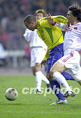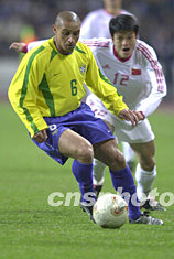 巴西隊排出三五二陣容,依靠“三R”組成銳利的鐵三角力圖控制中場,中國隊則擺出四五一陣容,采用中場密集攔截的戰(zhàn)術布置,瓦解巴西隊的進攻。開場后十五分鐘內(nèi),雙方互相試探,攻勢平平,只是巴西隊在十二分鐘時,右路連續(xù)獲得兩個角球機會,才掀起一絲波瀾。三十分鐘時,巴西隊在進攻左前方獲得直接任意球機會,里瓦爾多一記漂亮的弧線球繞過中國隊人墻,直奔球門左側,幸被中國隊門將劉云飛撲出。