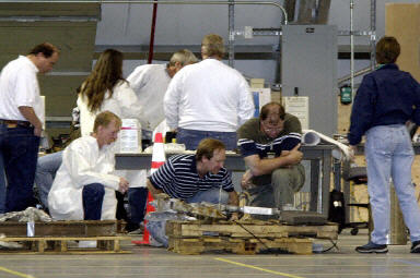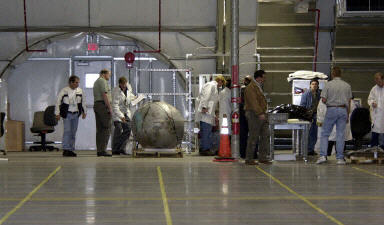 從路易斯安娜和德州經(jīng)過分析對比后的“哥倫比亞”號殘骸被陸續(xù)運(yùn)抵位于弗羅里達(dá)的肯尼迪航天中心,展開更深入的調(diào)查失事原因工作。圖為KSC工作人員接收殘骸物件進(jìn)行匯總登記。