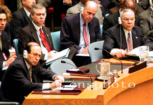 真所謂“不是冤家不聚頭”,伊拉克常駐聯(lián)合國(guó)代表穆罕默德·杜里列席會(huì)議,而且就落座于美國(guó)國(guó)務(wù)卿鮑威爾身旁。鮑威爾不時(shí)地瞟著杜里,看他聽(tīng)別人發(fā)言時(shí)忙些什么。發(fā)言中,鮑威爾稱伊拉克領(lǐng)導(dǎo)人是“瘋子”,始終玩弄各種花招,欺騙世界。他還強(qiáng)硬地要求伊拉克“必須服從”,解除武裝。杜里始終鎮(zhèn)靜地做著筆記。發(fā)言中,他很低調(diào)地表白:伊拉克已經(jīng)完全敞開(kāi)了武器核查的大門,目的是向全世界證明,沒(méi)有大規(guī)模殺傷性武器。他諷刺說(shuō):“這出乎有些人的意料,他們對(duì)我們前所未有的合作感到吃驚。”