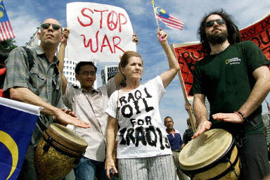 而在亞洲及澳洲,一些國(guó)家今日已展開(kāi)反戰(zhàn)示威游行,泰國(guó)、馬來(lái)西亞及新西蘭等國(guó)均有示威活動(dòng)。在泰國(guó)有大約3000人上街示威,高喊反戰(zhàn)口號(hào),而新西蘭有數(shù)以萬(wàn)計(jì)的示威者走上上街頭反對(duì)美對(duì)伊開(kāi)戰(zhàn)。