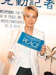 中新網(wǎng)2月25日電 香港歌手李克勤日前被邀往馬來西亞吉隆坡?lián)萎數(shù)嘏e行的“反戰(zhàn)音樂會”嘉賓,他是唯一一個來自香港的歌手,獲得當?shù)赜嘘P(guān)部門頒發(fā)的“和平大使”錦旗,克勤笑言自己像是香港小姐得獎。