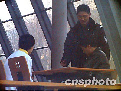 北京大學(xué)農(nóng)園餐廳二月二十五日發(fā)生自制黑火藥爆炸事故。圖為警察在餐廳前執(zhí)勤。作者:武仲林