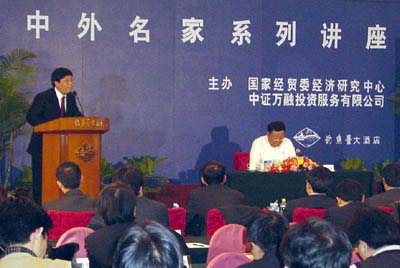 據(jù)了解,“中外名家系列講座”是由國家經(jīng)貿(mào)委經(jīng)濟(jì)研究中心和中證萬融投資服務(wù)有限公司聯(lián)合主辦。自2001年9月起已舉辦了37期(每月2期),受到社會(huì)各界特別是企業(yè)界的廣泛好評(píng)。參加此期講座的嘉賓中,有來自企業(yè)界的知名人士及各大媒體領(lǐng)導(dǎo)。此期講座由專項(xiàng)部主任支東升主持。