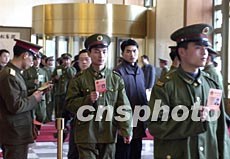 全國(guó)政協(xié)委員二十七日陸續(xù)抵京,北京人民大會(huì)堂安檢測(cè)試工作進(jìn)入最后階段。圖為解放軍工作人員手持兩會(huì)有效證件在大會(huì)堂內(nèi)進(jìn)行安檢測(cè)試。作者:廖文靜