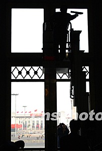 第十屆全國(guó)人大和政協(xié)盛會(huì)即將開幕,工作人員正在清洗北京人民大會(huì)堂東大門玻璃,準(zhǔn)備以潔凈亮麗的形象迎接盛會(huì)召開。作者:張煒