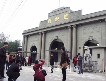 在門樓前,一九五八年被大煉鋼鐵融化的鐵門,現(xiàn)按照一九二九年“總統(tǒng)府”的照片,經(jīng)電子技術(shù)復(fù)原,四十五年后又重新恢復(fù)了原樣。東西兩座邊門共四扇,每扇鐵門的重量都超過(guò)一點(diǎn)五噸,而中間的大門每扇就近三噸。門樓上方的"總統(tǒng)府"三個(gè)閃著金光的大字,也是事隔五十八年后,去年十一月二十日才重新放上去的。
