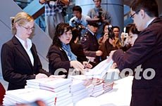 匯豐股控有限公司3月3日公布2002年全年業(yè)績,傳媒爭先在記者會上領(lǐng)取匯豐股控有限公司2002年全年業(yè)績報告,以第一時間發(fā)布新聞。洪少葵 攝