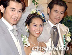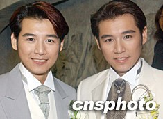 來(lái)自臺(tái)灣的組合TOPTWINZ(陳騰龍、陳躍虎兄弟)三月四日在香港“現(xiàn)代經(jīng)典”影樓與香港藝員朱茵一起拍攝主題為“花團(tuán)錦簇”的婚紗晚裝作品。錢興強(qiáng) 攝