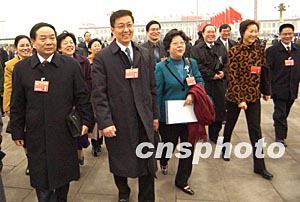 全國(guó)人大代表、上海市長(zhǎng)韓正(左二)五日率領(lǐng)上海人大代表出席十屆全國(guó)人大一次會(huì)議開幕式。作者:盛佳鵬