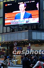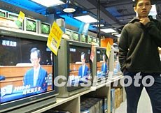 素有購(gòu)物天堂美譽(yù)的香港,商家關(guān)注稅務(wù)制度改革。三月五日公布的香港2003至2004年度財(cái)政預(yù)算案成為此間商家關(guān)注熱點(diǎn),圖為電器店里的電視機(jī)播出財(cái)政司司長(zhǎng)梁錦松提交的預(yù)算報(bào)告。潘索菲 攝
