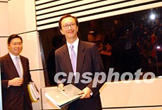 香港特區(qū)政府3月5日公布備受關注的香港2003至2004年度財政預算案,財政司司長梁錦松與財經(jīng)事務及庫務局局長馬時亨出席記者會,回答有關預算案問題。 洪少葵 攝