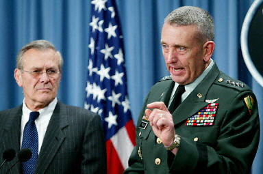 3月5日,在美國(guó)華盛頓五角大樓,美國(guó)國(guó)防部長(zhǎng)拉姆斯菲爾德(左)和美國(guó)中央司令部司令弗蘭克斯出席記者招待會(huì)。弗蘭克斯說(shuō),美軍目前已經(jīng)為對(duì)伊拉克采取軍事行動(dòng)作好了準(zhǔn)備。