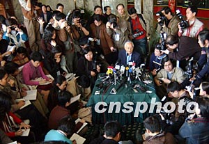 準(zhǔn)三點鐘,吳敬璉教授來到現(xiàn)場,身穿西服,不系領(lǐng)帶,頭發(fā)紋絲不亂。他從記者群中擠了進去,面對不停閃光的鏡頭,他神閑氣定,極其認真地回答著記者們提出的每一個問題。