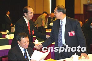 正在北京出席全國(guó)政協(xié)十屆一次會(huì)議的何鴻燊與鄒哲開在港澳政協(xié)委員聯(lián)組會(huì)上互致問(wèn)候。作者:毛建軍