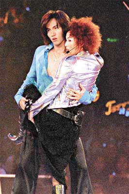 鄭秀文在其表演環(huán)節(jié)中,先獨(dú)唱一首,再介紹一身殺手打扮的Jerry出來為她伴舞。隨即二人還合唱《月亮代表我的心》,手拖手外,還邊唱邊舞,當(dāng)中不乏貼身舞姿,Jerry更一手抱著Sammi的大腿。