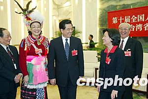 胡錦濤向臺灣代表團的各位代表,并向廣大臺灣同胞致以誠摯的問候。會場上,發(fā)言踴躍,親情融融。胡錦濤認真聽取大家的發(fā)言。他說,中共十三屆四中全會以來,我們堅持“和平統(tǒng)一、一國兩制”的基本方針,應(yīng)對挑戰(zhàn),排除干擾,大力推動對臺工作,取得了重大成果。國際社會普遍堅持承認一個中國的基本立場,兩岸關(guān)系的基本格局和發(fā)展趨勢沒有改變。這是以江澤民為核心的第三代中央領(lǐng)導(dǎo)集體正確決策和堅強領(lǐng)導(dǎo)的結(jié)果,是包括臺灣同胞在內(nèi)的全體中華兒女共同努力的結(jié)果。