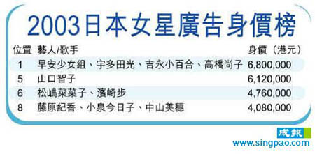 而曾被指為是紀(jì)香姐接班人的米倉(cāng)涼子,雖與NHK大河劇《武藏MUSASHI》的拍檔市川新之助傳緋聞,但后者被踢爆已有一名私生女,連帶她的形象亦受拖累,身價(jià)由原來的三百零六萬港元,下降至二百七十多萬,位列第十六位。而人多勢(shì)眾的早安少女組,身價(jià)則保持不變,繼續(xù)以六百八十萬港元位列榜首。